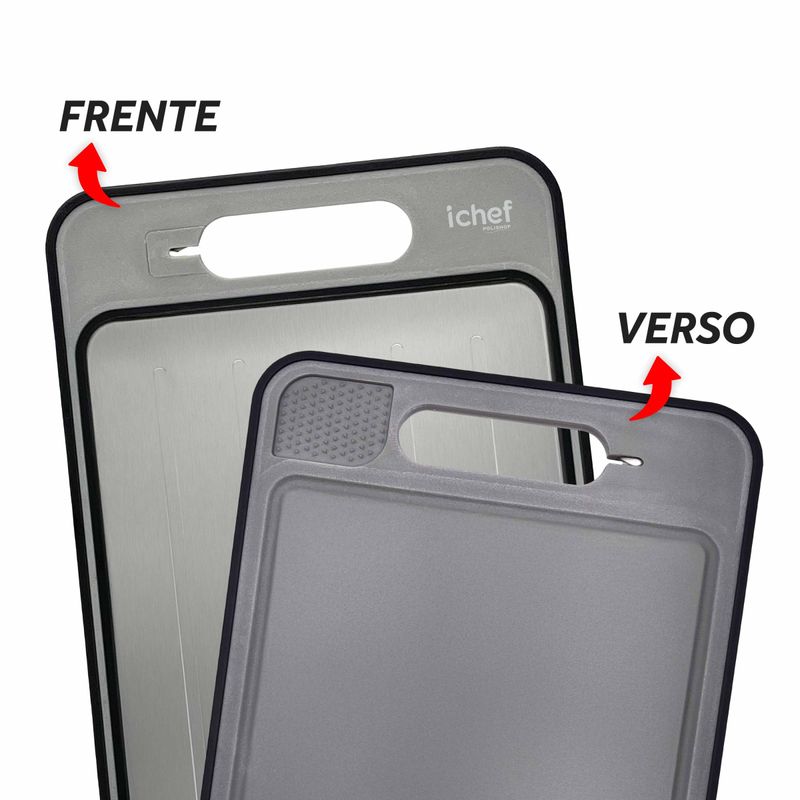 Se a faca é a melhor amiga do cozinheiro, a tábua é sua fiel escudeira! Ela garante cortes precisos e evita que os alimentos entrem em contato com superfícies inadequadas. Mas e se, além disso, ela trouxesse ainda mais praticidade? Então você precisa conhecer a Tábua de Corte Dupla Face ichef Dual Cut que vai transformar sua rotina na cozinha! De um lado, cortes precisos para vegetais, frutas e outros alimentos. Do outro, ela acelera o descongelamento de alimentos e oferece uma superfície de corte higiênica, tornando tudo mais prático. E para deixar sua experiência ainda mais completa, ela conta com bordas à prova de derramamento, afiador de facas integrado e um moedor, tudo pensado para facilitar o seu dia a dia.