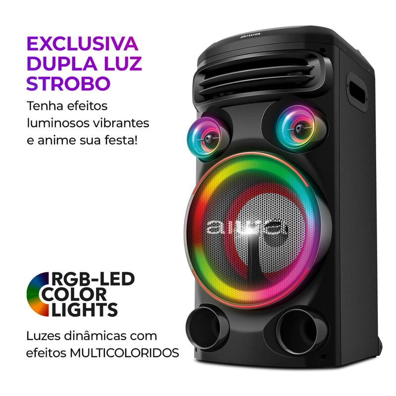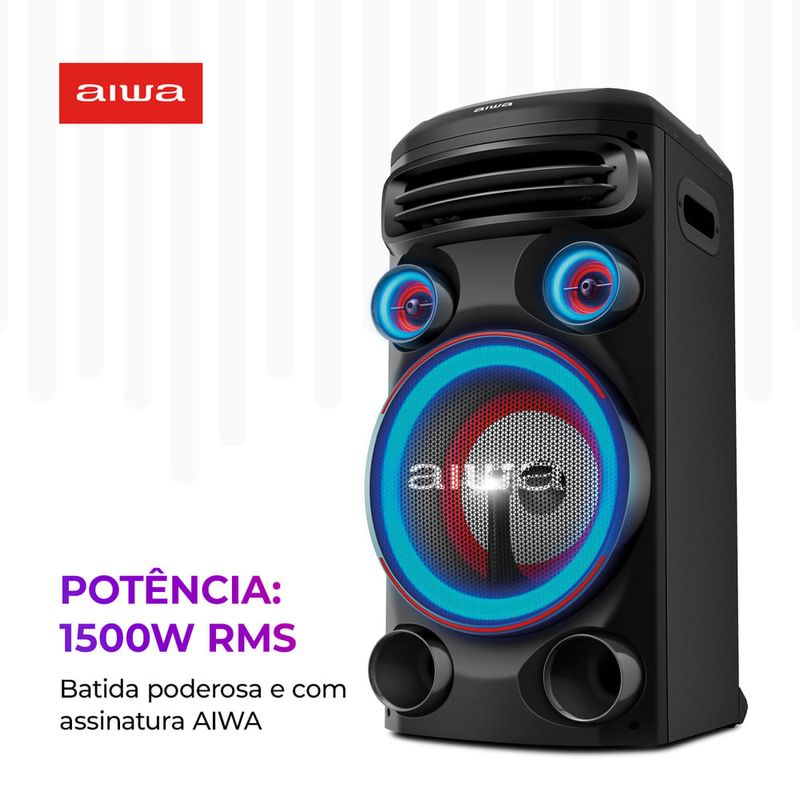 Som, luz, ação! A Torre de Som X Sound 1 AWS-T1W-01B possui 1500W RMS de potência e o som poderoso é garantia de um som de alta definição com graves mais profundos, que vão aquecer qualquer pista! Além disso, as funções Exclusiva Dupla Luz Strobo e o RGB Led Color Lights conferem um cenário de luzes multicoloridas e efeitos luminosos vibrantes que não vão deixar ninguém parado. Saiba mais sobre a Torre de Som X Sound 1 AWS-T1W-01B da Aiwa: