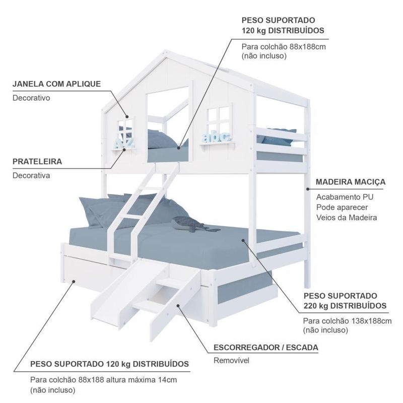 Treliche Casal/ Solteiro Casinha Dos Sonhos Kit Escada/ Escorregador Madeira Maciça Branco Megamobilia