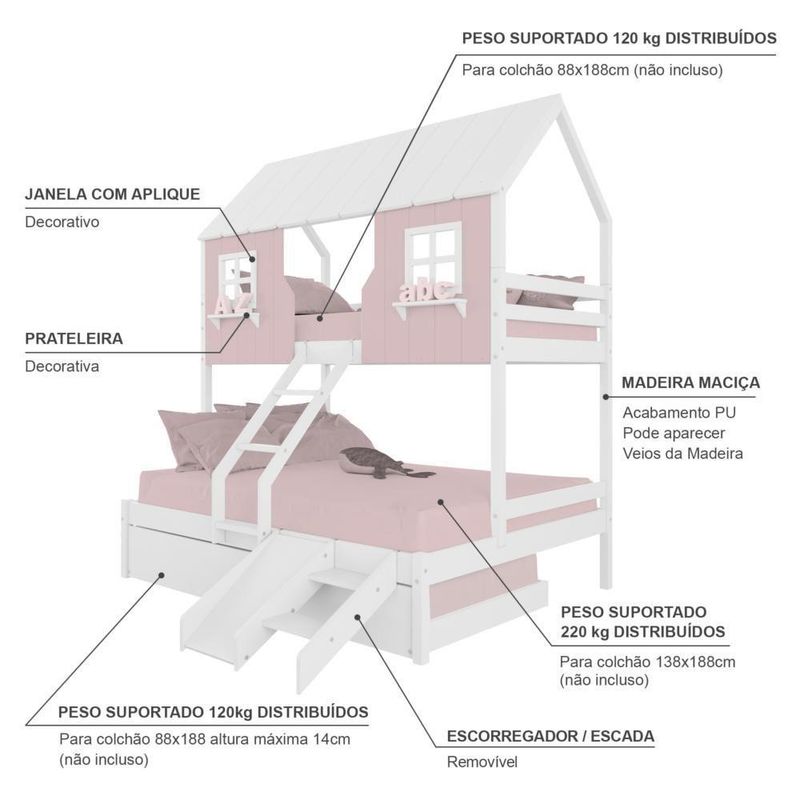 Quantidade de Volumes: 06 Material Principal: Madeira Maciça | Cor Predominante: Rosa/ Branco | Necessita Montagem: Sim | Acompanha Colchão: Não | Tipo de Cama: Beliche Casal/ Solteiro | Altura: 230 | Largura: 146,7 | Comprimento: 199 | Peso: 108 | Peso máximo suportado: 120 e 220 | Cor Via: Rosa | Peso com Embalagem: 108 | Comprimento com Embalagem: 192 | Largura com Embalagem: 30 | Altura com Embalagem: 30 | Tamanho da Cama: Beliche Casal/ Solteiro | Descrição do Tamanho: Beliche Casal/ Solteiro