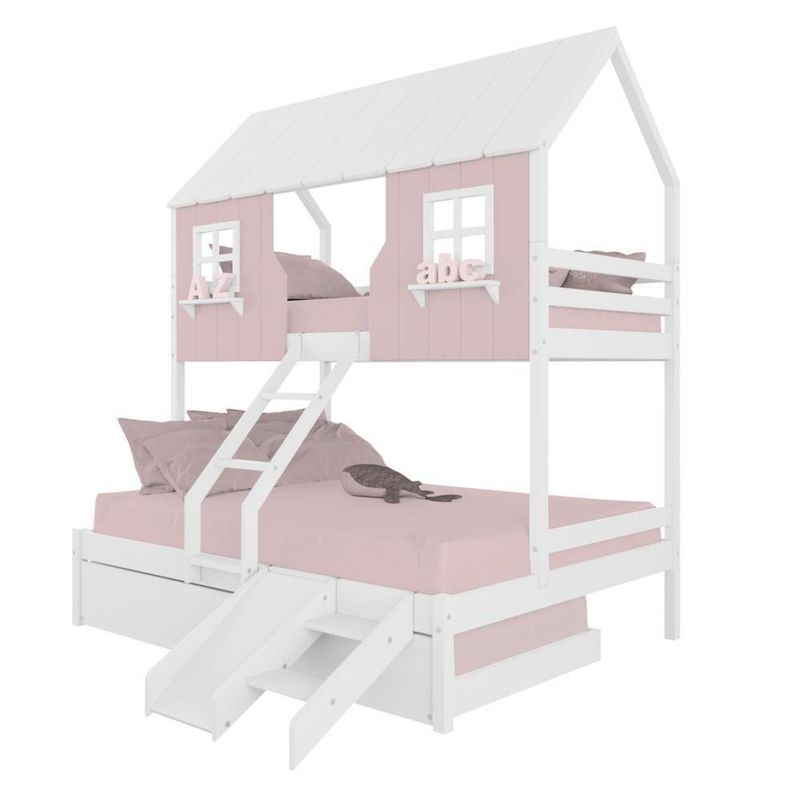 Treliche Casal/ Solteiro Casinha Encantada Com Kit Escada/ Escorregador Madeira Maciça Rosa/ Branco Megamobilia