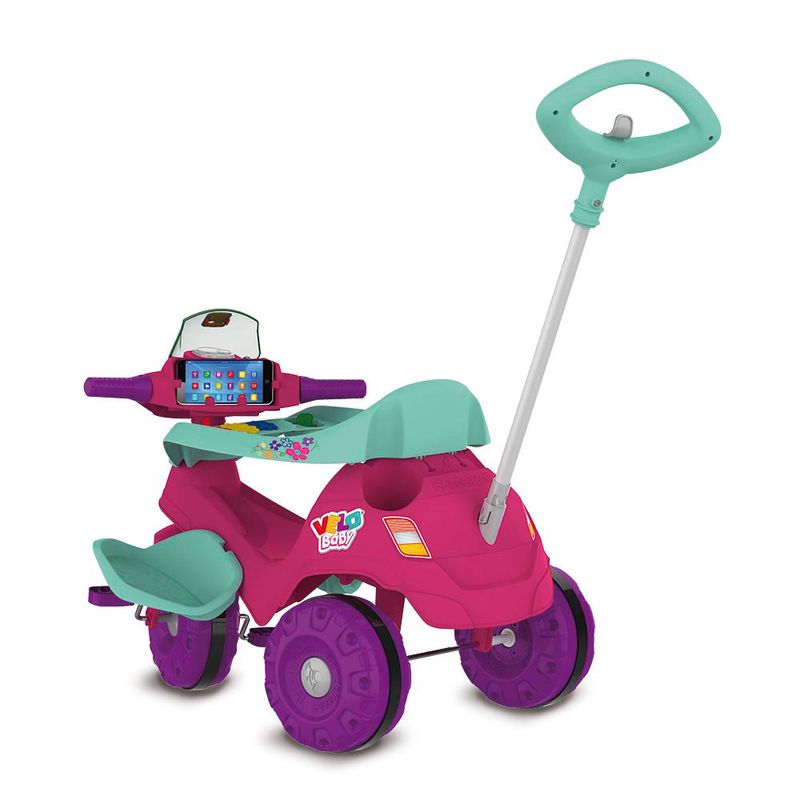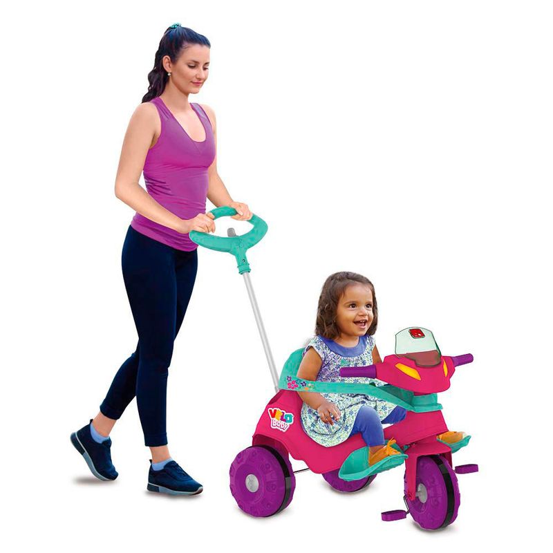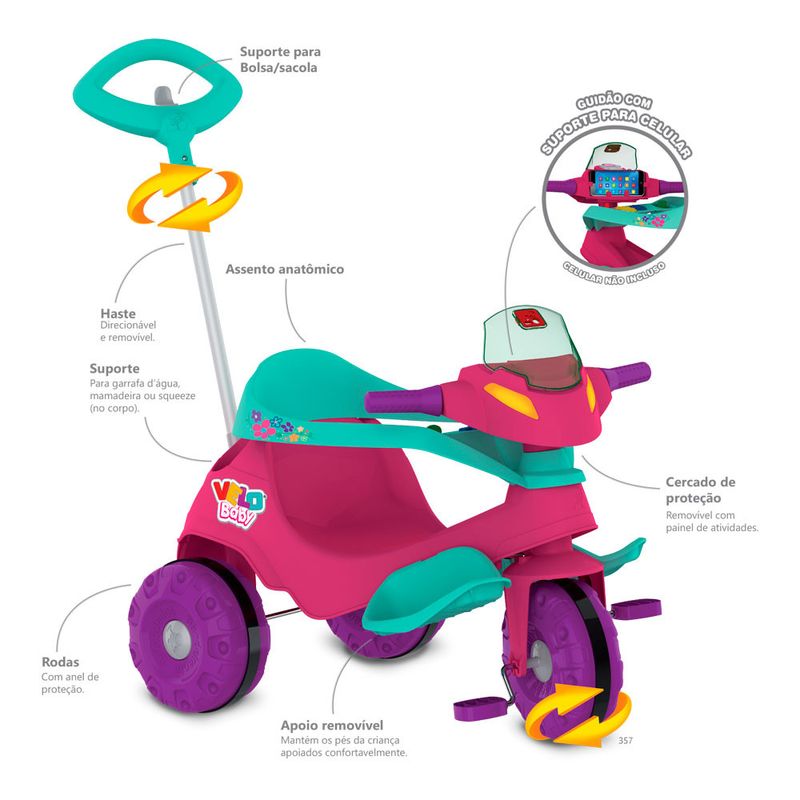 Função passeio: O adulto utiliza a haste direcionável para conduzir o triciclo. Basta, colocar o cercado de proteção e o apoio dos pés.