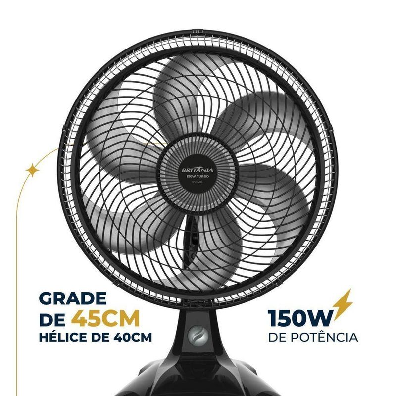 Experimente o poder e a eficiência do nosso Ventilador de 150W! Ventilador Britânia BVT405 Tecnologia Maxx Force.Com a nova hélice de 6 pás e tecnologia Maxx Force, você conta com uma vazão de ar superior e um desempenho impressionante. A hélice de 40cm proporciona uma ventilação máxima, ideal para qualquer ambiente.Além disso, possui classificação energética A, que garante baixo consumo de energia sem comprometer a performance. O Ventilador Britânia BVT405 conta também com 3 velocidades: suave, moderada e intensa. Você ajusta a ventilação conforme sua necessidade.Nossa preocupação com a é prioridade! O motor interrompe o funcionamento em caso de superaquecimento e o sistema de travamento das grades evita acidentes. Com 3 opções de inclinação vertical e oscilação horizontal automática, você direciona o fluxo de ar como preferir. E a alça na grade traseira facilita o do aparelho para qualquer lugar. Utilize-o na mesa ou na parede, graças ao design 2 em 1 que oferece versatilidade. Transforme seu ambiente com conforto e praticidade com o Ventilador Britânia BVT405 Tecnologia Maxx Force 150W!- 3 velocidades