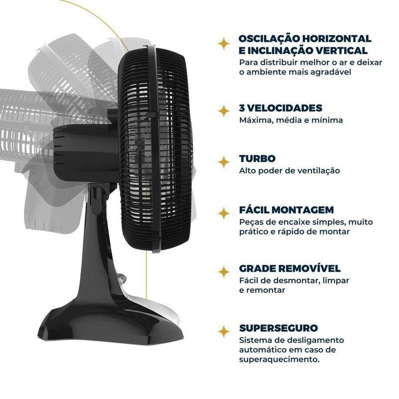 - Oscilação horizontal automática com sistema de acionamento (botão integrado à carcaça)