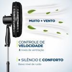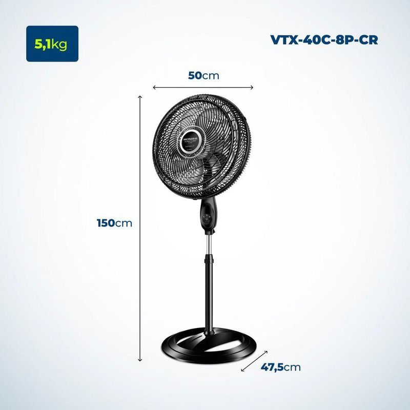 Com controle remoto, 40 CM, 8 pás e 3 velocidades, o Ventilador de coluna 40 cm Super Turbo 8 Pás Control VTX-40C-8P-CR é muito mais vento. Ele tem baixo nível de ruído, sistema oscilante lateral e ajuste de altura. Sua hélice de 8 pás tem design aerodinâmico, o que torna o ambiente mais fresco e arejado. Escolha uma das 3 velocidades usando o controle remoto ou o painel touch. Ele tem regulagem de altura de 1,19 A 1,5 M. Para ambientes mais amplos, você pode usar seu sistema oscilante. Já sua inclinação vertical regulável direciona o fluxo de ar para cima ou para baixo. Como a grade frontal é removível, ele ainda é fácil de montar e desmontar para limpeza. Ele também é fácil de carregar porque tem uma alça para transporte. Já a base antiderrapante traz mais segurança. O Ventilador 40 cm Super Turbo 8 Pás Control VTX40C8PCR foi desenvolvido para uso doméstico, sendo melhor para uso residencial. Tudo isso com 1 ano de garantia Mondial.