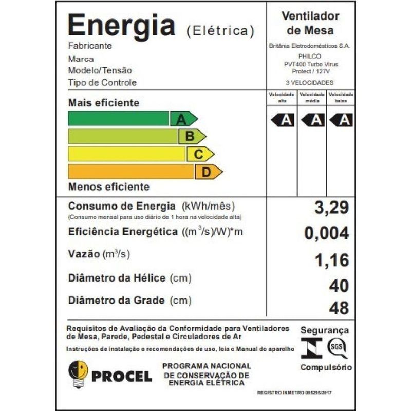 Se refresque com o Ventilador Philco Turbo Virus Protect. Ventilador de mesa, possui hélice com 6 pás e diâmetro de 40cm, sistema oscilante, garantindo um excelente desempenho! Com 160W de potência e 3 velocidades, que variam entre mínima, média e máxima, a eficiência de ventilação com o seu Ventilador Philco está garantida. Além de oferecer inclinação vertical regulável, proporcionando melhor direcionamento do fluxo de ar, a grade do Ventilador é plástica e removível, facilitando a limpeza. O Ventilador é Vírus Protect, ou seja, diminui em até 99% a proliferação de vírus, bactérias e mofo dentro do ambiente, e elimina odores, fumaça e partículas de pólen presentes no ar. Seu fusível térmico de segurança e porta fio garantem praticidade até na hora de guardar. Quer economia de energia? Conte com o Ventilador Philco, pois ele possui classificação energética A para você curtir os dias mais quentes sem se preocupar com a conta de luz.Com o Ventilador Philco Turbo Virus Protect sua casa fica do jeitinho que você gosta!- Hélice de 6 pás