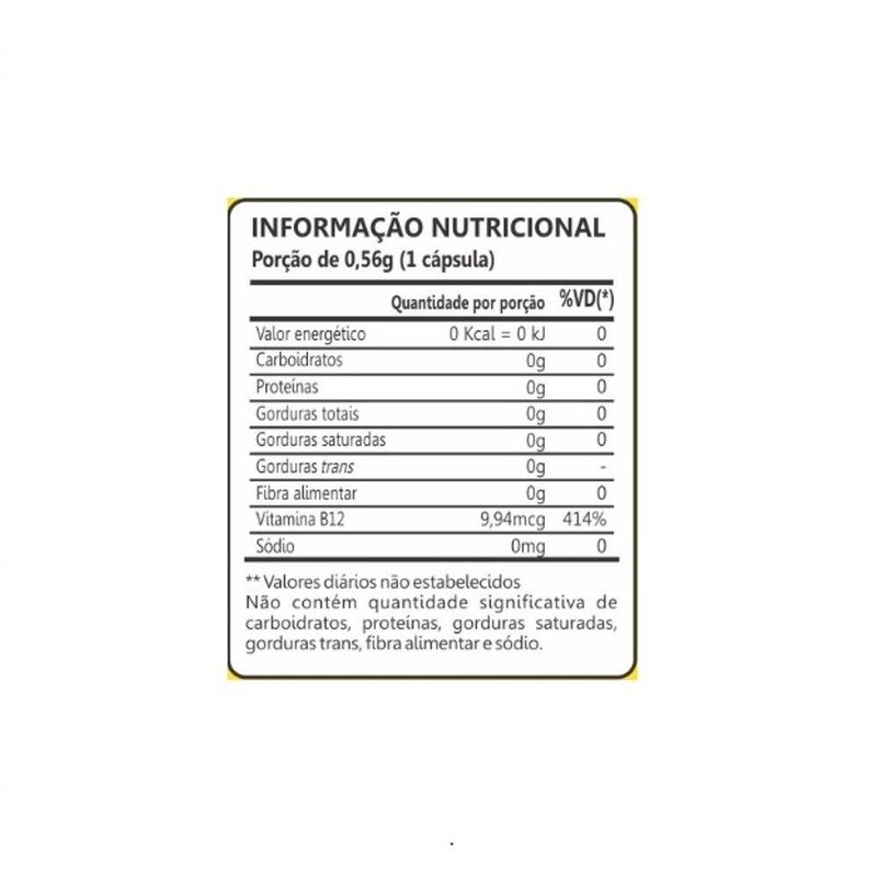 Informação Nutricional Vitamina B12 (60 caps) - MaxinutriPorção de 0,56g (1 cápsula)Quantidade por porção%VD(*)Valor energético0 kcal = 0kj0Carboidratos00Proteínas00Gorduras totais00Gorduras Saturadas00Gorduras Trans00Fibra Alimentar0-Vitamina B129,94mcg414%Sódio0mg0* % Valores Diários com base em uma dieta de 2.000Kcal ou 8400kJ. Seus valores diários podem ser maiores ou menores dependendo das suas necessidades energéticas. Obs: Pode haver pequenas variações na informação nutricional, de acordo com o sabor.