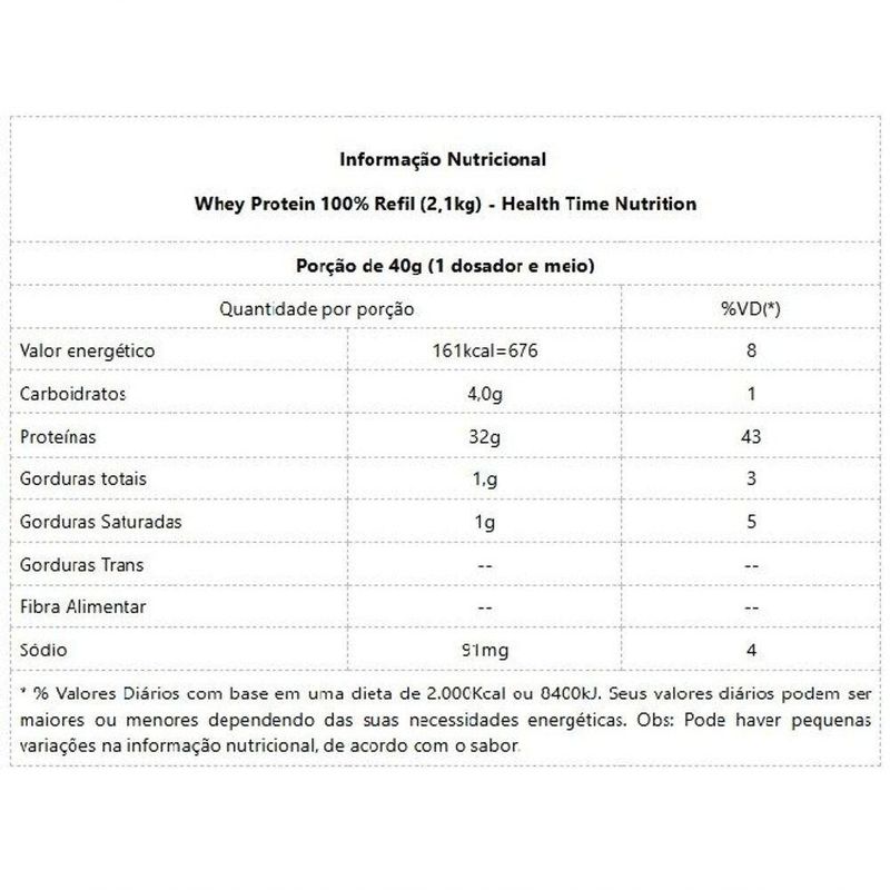 Informação Nutricional Whey Protein 100% Refil (2,1kg) - Health Time NutritionPorção de 40g (1 dosador e meio)Quantidade por porção%VD(*)Valor energético161kcal=6768Carboidratos4,0g1Proteínas32g43Gorduras totais1,g3Gorduras Saturadas1g5Gorduras Trans----Fibra Alimentar----Sódio91mg4* % Valores Diários com base em uma dieta de 2.000Kcal ou 8400kJ. Seus valores diários podem ser maiores ou menores dependendo das suas necessidades energéticas. Obs: Pode haver pequenas variações na informação nutricional, de acordo com o sabor. AMINOGRAMA Alanina1425mgArginina732mgÁc. Aspártico3827mgCisteína630mgGlutamina6103mgGlicina570mgHistidina453mgIsoleucina1790mgLeucina2905mgLisina2284mgMetionina588mgFenilalanina768mgProlina1418mgSerina1148mgTreonina1987mgTriptofnano483mgTirosina648mgValina1378mg