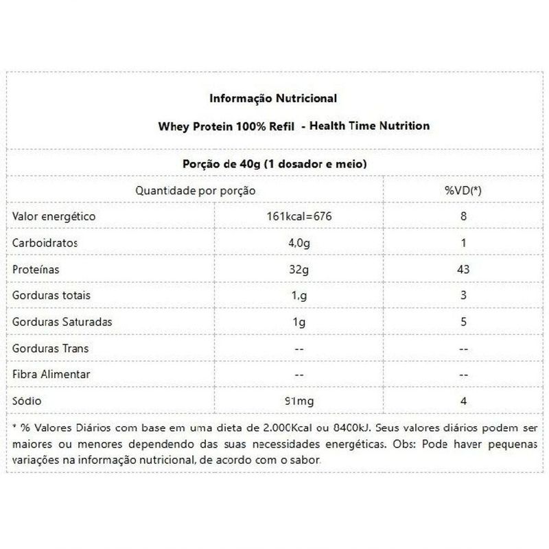 Informação Nutricional Whey Protein 100% Refil (900kg) - Health Time NutritionPorção de 40g (1 dosador e meio)Quantidade por porção%VD(*)Valor energético161kcal=6768Carboidratos4,0g1Proteínas32g43Gorduras totais1,g3Gorduras Saturadas1g5Gorduras Trans----Fibra Alimentar----Sódio91mg4* % Valores Diários com base em uma dieta de 2.000Kcal ou 8400kJ. Seus valores diários podem ser maiores ou menores dependendo das suas necessidades energéticas. Obs: Pode haver pequenas variações na informação nutricional, de acordo com o sabor. AMINOGRAMA Alanina1425mgArginina732mgÁc. Aspártico3827mgCisteína630mgGlutamina6103mgGlicina570mgHistidina453mgIsoleucina1790mgLeucina2905mgLisina2284mgMetionina588mgFenilalanina768mgProlina1418mgSerina1148mgTreonina1987mgTriptofnano483mgTirosina648mgValina1378mg