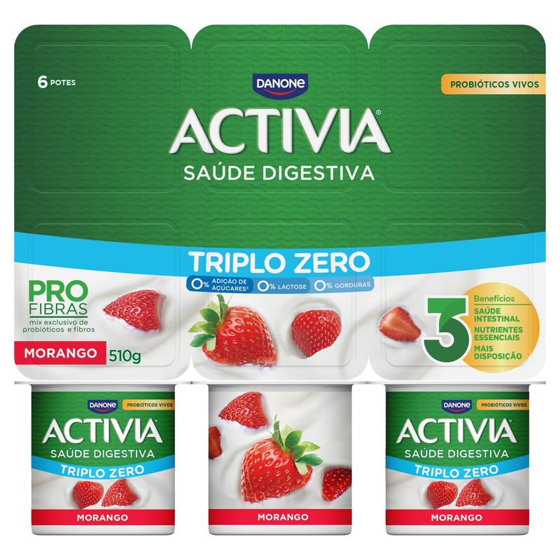 Leite Fermentado Desnatado Morango Zero Lactose ACTIVIA Triplo Zero Bandeja 510g 6 Unidades