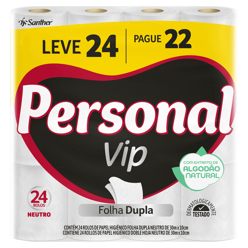 Papel Higiênico PERSONAL Vip Folha Dupla Leve 24 Pague 22 Unidades 30 Metros